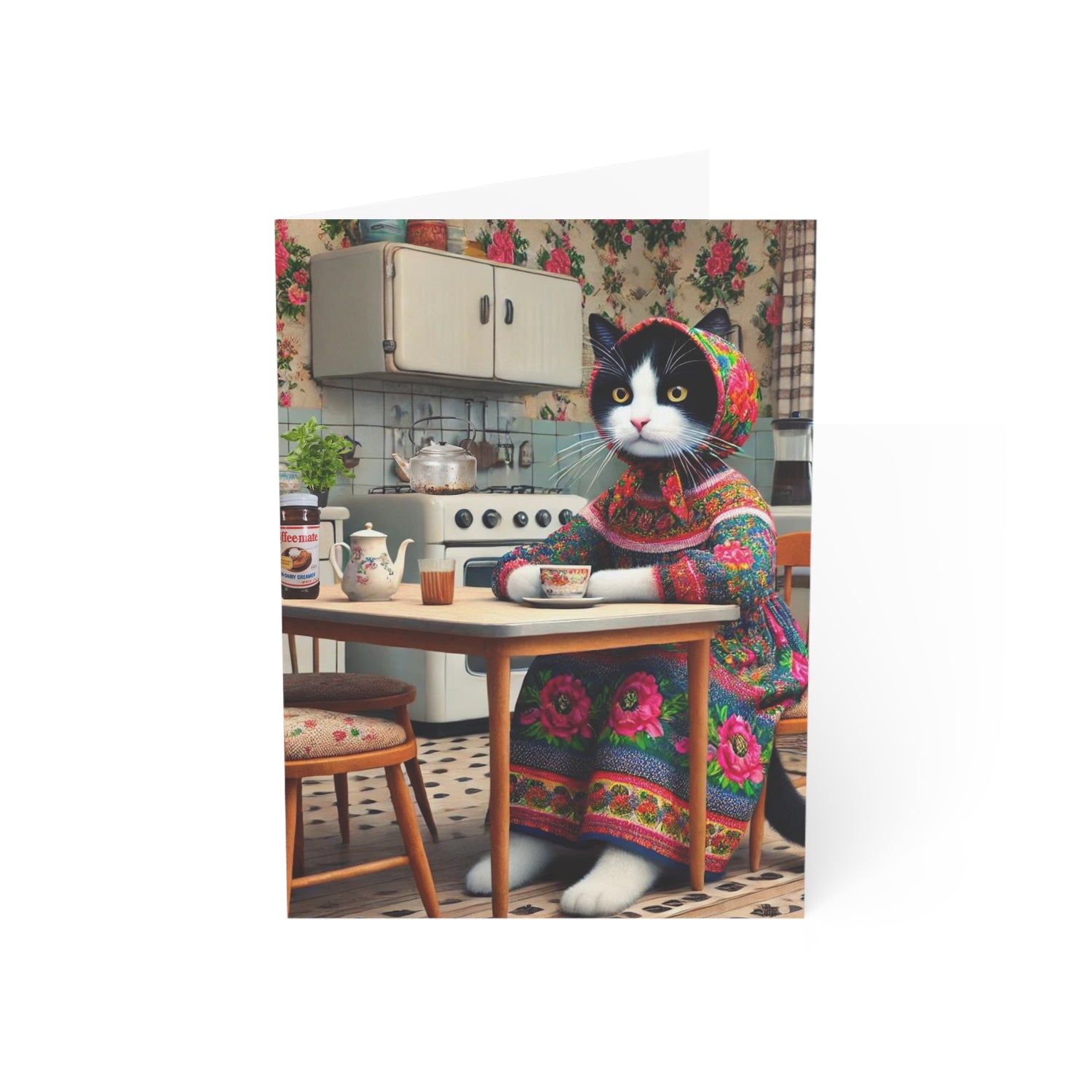 Babushka Cat, Tuxedo Cat Art, Kitty Drinking Her Morning Tea, Kitschy Cat Kitchen Wall Art, Canvas Wall Art, Nostalgic Art