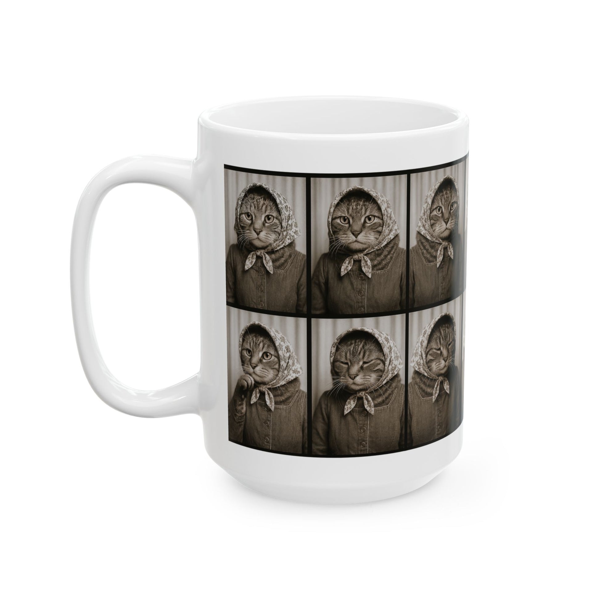 Babushka Cat Photo Booth Cat Humor Ceramic Mug