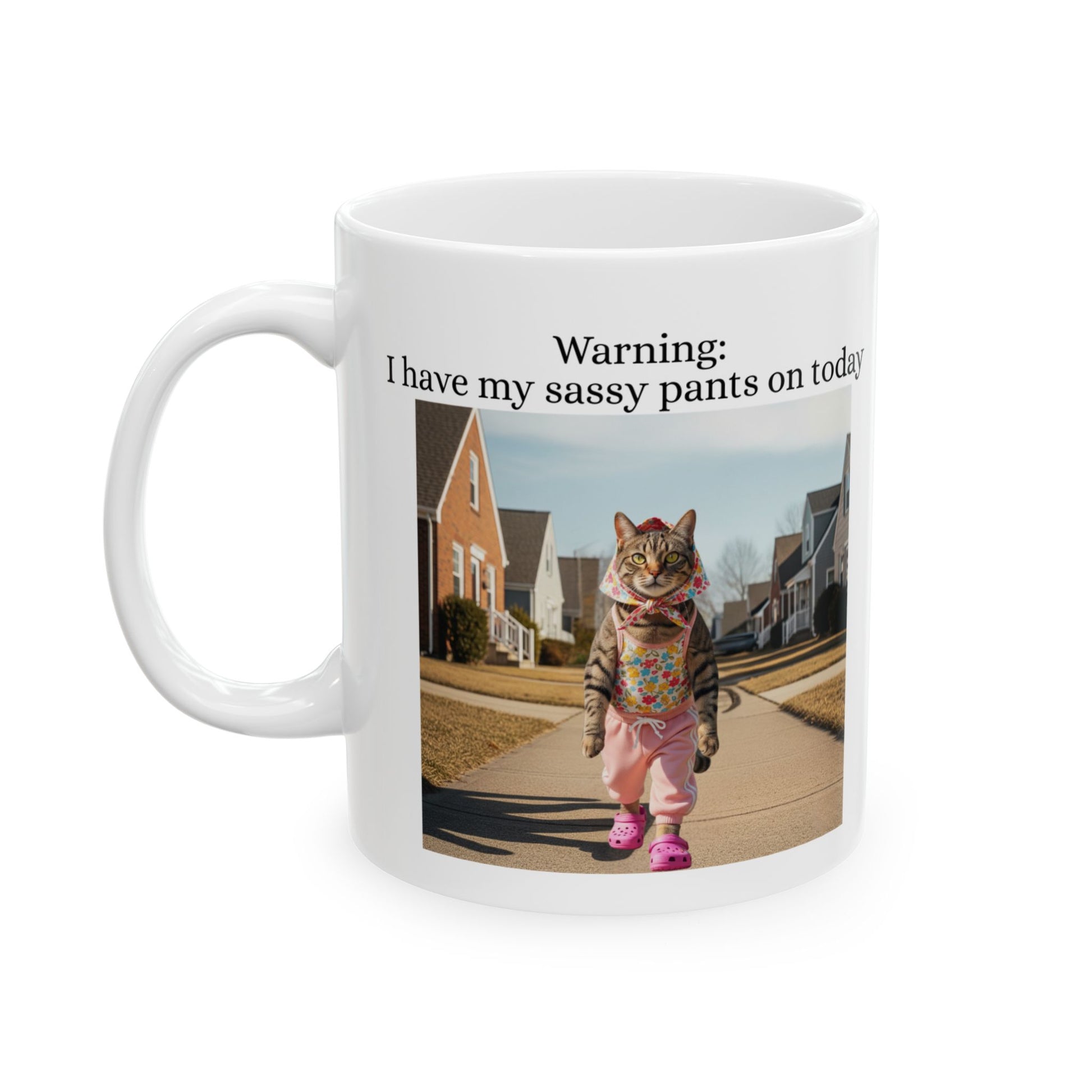 Babushka Cat Sassy Pants Ceramic Mug adds a touch of whimsy and humor to your morning coffee routine. Perfect for cat lovers and those who appreciate quirky designs. Ideal for gifting during birthdays, Christmas, or as a pick-me-up surprise.