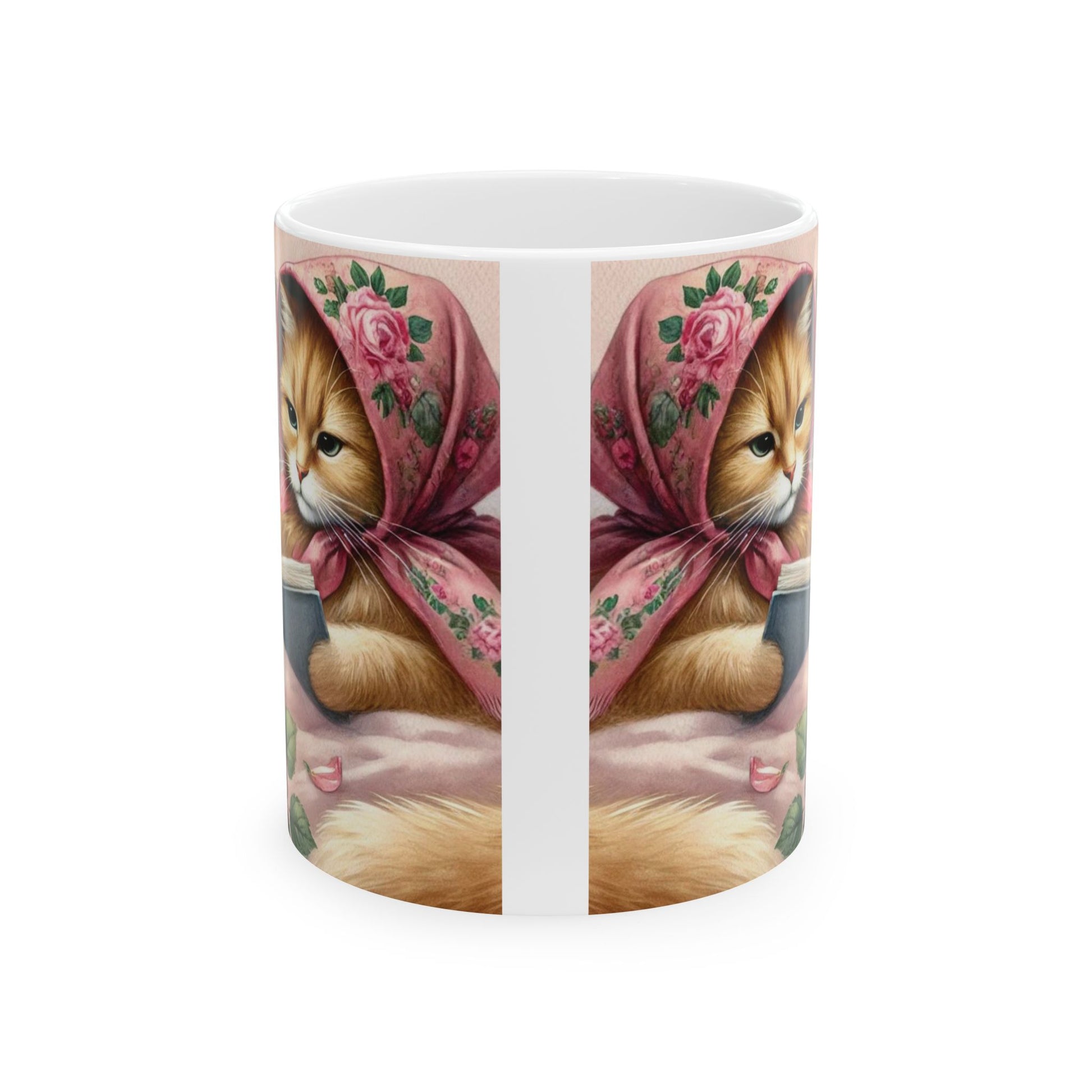 Adorable Coquette Babushka Cat ceramic mug featuring a cat lover and book lover design. Perfect for enjoying your favorite hot beverages in style. Ideal for cat enthusiasts and bookworms, this mug is great for cozy mornings in bed or relaxing afternoons reading a book. Great gift for cat owners and readers alike, suitable for birthdays, holidays, and special occasions.